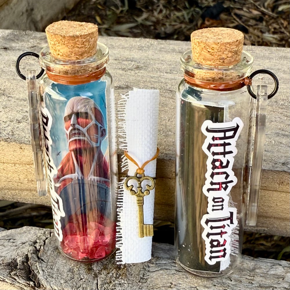 The walls have been broken open with this classic anime in a bottle. Filled with titan remain crushed rock, a cellar key, a fitting generated themed backing, adorning an acrylic character charm and our canvas typewriter quote scroll with the following text: