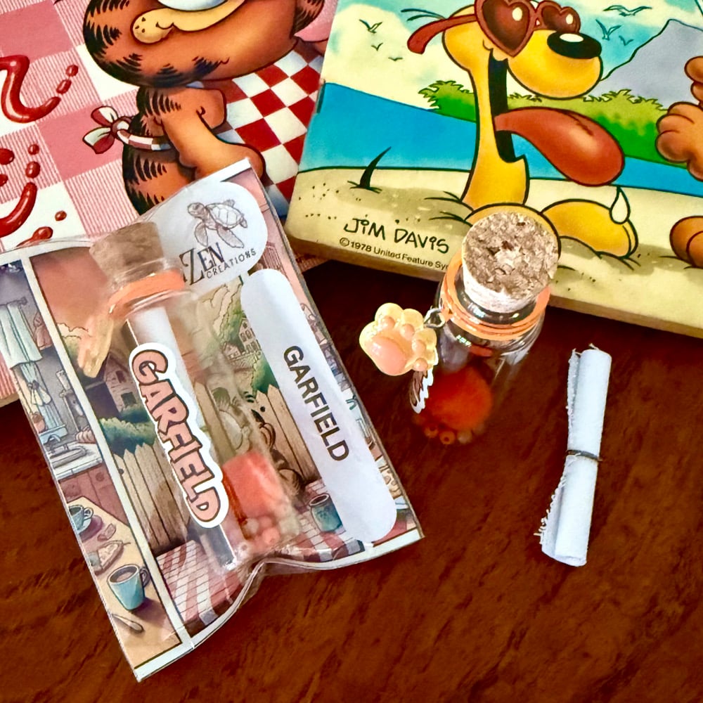 Cute and inspired by his original cartoon style feel, our Garfield inspired bottle adorns an original comic style background setting and a resin cat paw pendant you can add to your own jewellery and our canvas typewriter quote scroll with the following text: