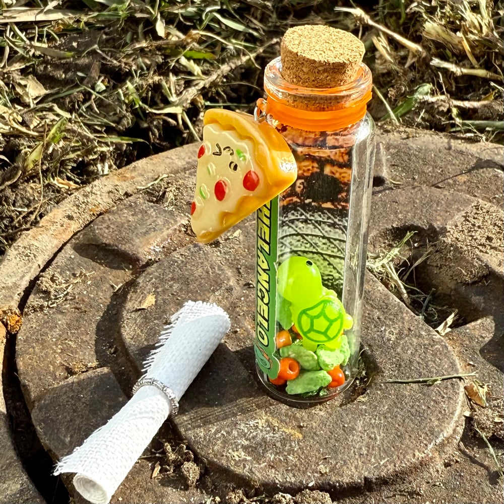 Adorning a large slice of pizza charm, thematic background and feel of the the SNES sewer level, a baby turtle piece, the reverse bottle side showing each character from the arcade game selection screen and our canvas typewriter quote scroll with the following text: